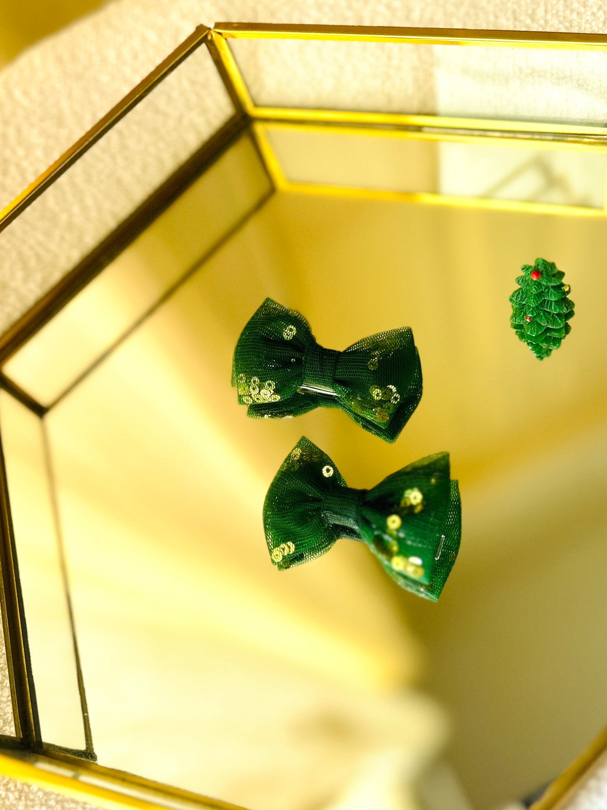 Add some festive flair to your holiday look with our #A# 004 Christmas collections! These glittering green bow clips are the perfect accessory to add a touch of sparkle to any hairstyle. Expertly crafted with high-quality materials, they are sure to hold your hair in place while also adding a touch of elegance.