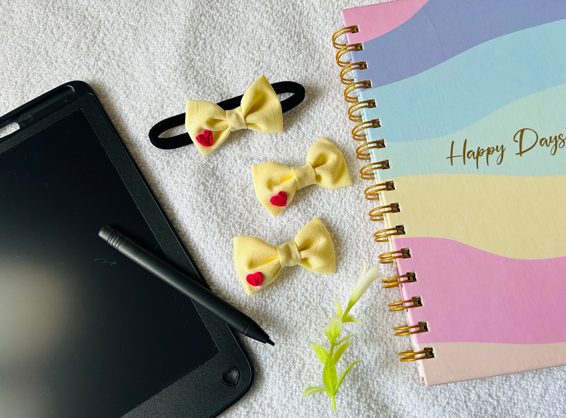 These yellow bows and headbands are expertly crafted with an embroidered heart design. The bright yellow color is sure to add a pop of cheer to any outfit. Made with high-quality materials, these bows are both stylish and durable. Perfect for adding a touch of playfulness to your little one's look.